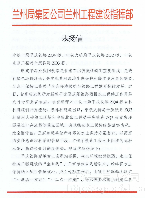 表揚是激勵,更是責任。項目負責人表示,項目團隊將以此次通報表揚為契機,持續發揚“鐵軍”作風,以更嚴標準、更實舉措推進后續施工,全力將平慶鐵路項目打造為“精品工程、綠色工程、放心工程”,為推動甘肅地區鐵路建設高質量發展貢獻力量。