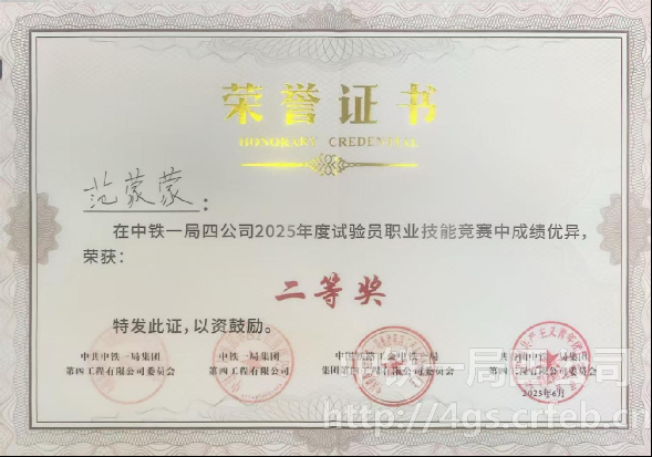 四公司2025年試驗(yàn)員職業(yè)技能競(jìng)賽“二等獎(jiǎng)”獲獎(jiǎng)證書(shū)