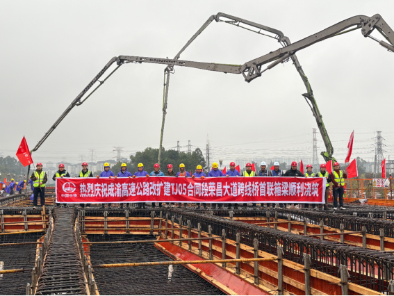 榮昌大道跨線橋作為成渝高速公路改擴(kuò)建工程的重要控制性節(jié)點(diǎn)之一,其結(jié)構(gòu)復(fù)雜、交通組織難度大、施工技術(shù)要求高。此次澆筑的首聯(lián)箱梁為(1聯(lián)4跨),全長(zhǎng)100米,采用“滿堂支架現(xiàn)澆+貝雷梁門洞現(xiàn)澆”施工工藝。為確保澆筑一次成功,項(xiàng)目部提前周密布局、科學(xué)籌劃,實(shí)行領(lǐng)導(dǎo)班子帶班制度,落實(shí)網(wǎng)格化管理。從方案編制、技術(shù)交底、模板安裝、鋼筋綁扎到混凝土供應(yīng)、澆筑工藝、振搗控制,每一個(gè)環(huán)節(jié)都嚴(yán)格把關(guān),實(shí)施“全過程、全鏈條”的質(zhì)量管控。在施工過程中,項(xiàng)目團(tuán)隊(duì)克服了雨季影響、高空作業(yè)風(fēng)險(xiǎn)、周邊交通疏導(dǎo)壓力等多重挑戰(zhàn),嚴(yán)格落實(shí)安全生產(chǎn)責(zé)任制,強(qiáng)化現(xiàn)場(chǎng)安全防護(hù)與環(huán)保措施,確保了施工安全“零事故”、質(zhì)量“零缺陷”、進(jìn)度“零延誤”。