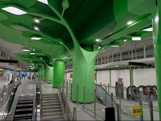 溪涌站被譽為“把公園搬進地下”的車站,當之無愧成為全線焦點。其卓越的“顏值”背后,是現代建造技藝與人文設計理念的深度交融。?車站以?“陽光+”為設計理念,巧妙引入?“生態綠谷”? 概念。設計團隊將古樹意象融入建筑結構與燈光設計,兩側墻面靈感來源于遠山輪廓,既有效延展了空間視覺,又弱化了地下空間的封閉感,營造出明亮通透、富有生命力的站內氛圍。