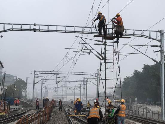 施工期間,接觸網(wǎng)專業(yè)累計(jì)完成基礎(chǔ)施工25處、硬橫跨架設(shè)5組、下錨補(bǔ)償裝置安裝8套,承導(dǎo)線架設(shè)2.61條公里,為列車牽引動(dòng)力穩(wěn)定供應(yīng)提供了可靠支撐。通號(hào)專業(yè)完成配線表拆配線作業(yè),恢復(fù)相關(guān)信號(hào)機(jī)、道岔保險(xiǎn)功能,并積極配合電務(wù)部門完成聯(lián)鎖試驗(yàn),確保各系統(tǒng)設(shè)備穩(wěn)定運(yùn)行。。