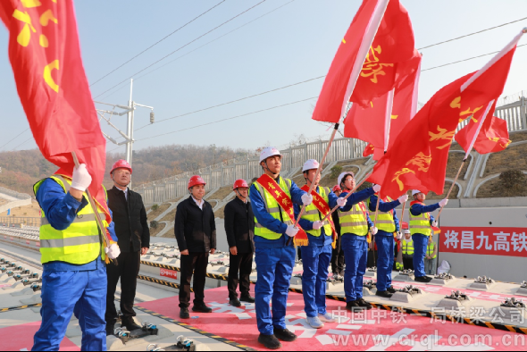 昌九城際鐵路公司黨委書記、總經理郭建光,副總經理羅少華,昌九城際鐵路公司昌九指揮部指揮長夏小任,中鐵一局副總經理潘小虎,八公司黨委書記、執行董事秦定松,新運公司總經理李怡,八公司副總經理張忠文,新運公司副總經理岳恒利及設計、監理等單位代表出席了鋪軌啟動儀式并為參建者授旗。