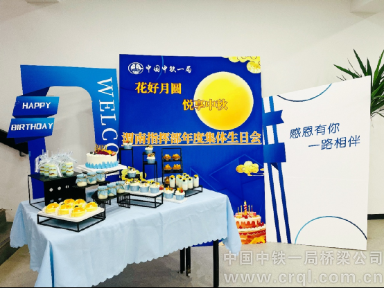 活動現場,指揮部被繽紛的氣球與精美的蛋糕裝點得格外溫馨?!盎ê迷聢A、悅享中秋”與“集體生日會”的主題標語交相輝映,營造出濃厚的節日氛圍與集體歡慶的喜悅。