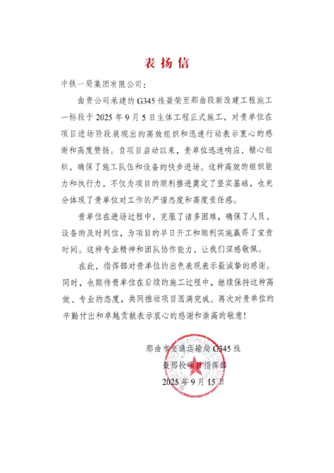 近日,那曲市交通運(yùn)輸局G345線聶那段項(xiàng)目指揮部發(fā)來表揚(yáng)信,對(duì)中鐵一局在G345國道聶榮至那曲段改建工程項(xiàng)目中的卓越表現(xiàn)予以肯定,表揚(yáng)公司在項(xiàng)目進(jìn)場(chǎng)階段高效組織、迅速行動(dòng),確保了施工隊(duì)伍和設(shè)備的快步進(jìn)場(chǎng),為項(xiàng)目的順利推進(jìn)奠定了堅(jiān)實(shí)基礎(chǔ)。