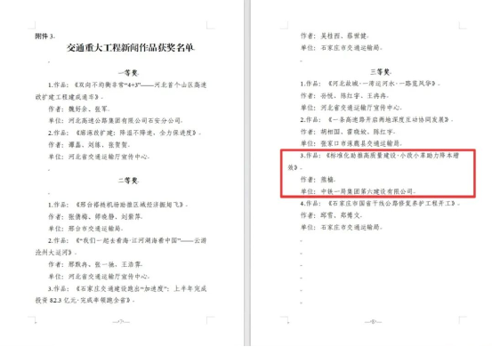中鐵一局六公司員工榮獲河北省交通重大工程新聞作品三等獎(jiǎng)