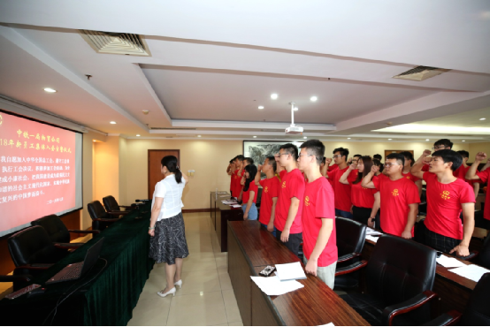 7月11日,公司34名新入職員工穿著紅色的體恤衫,在工會組織下舉行了集體入會儀式。大家面對工會會徽,隨著領(lǐng)誓人的帶領(lǐng),共同舉起右手莊嚴宣誓,鄭重承諾,使新加盟員工實現(xiàn)“入職”即“入會”。