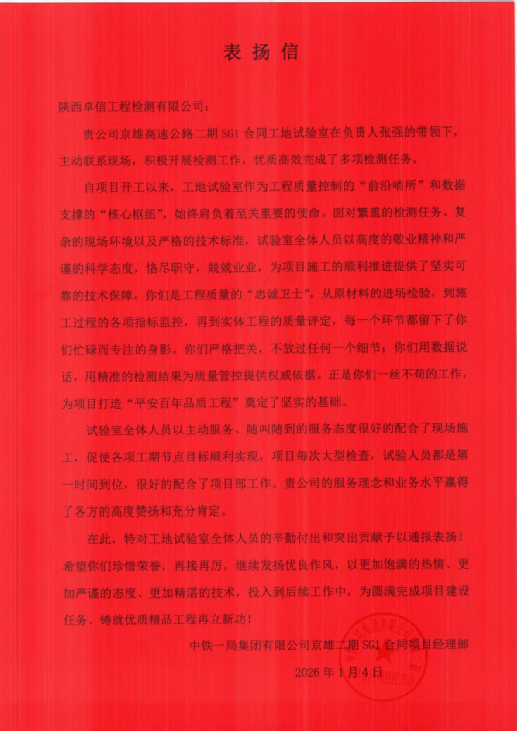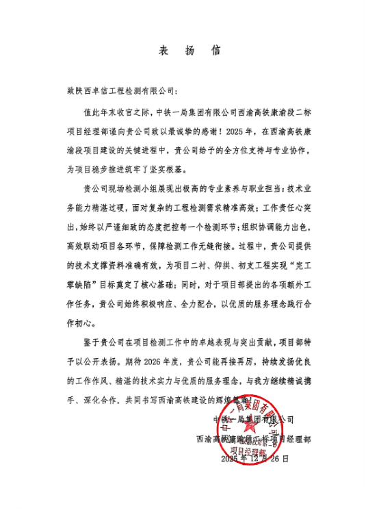 與此同時,在西渝高鐵康渝段二標(biāo)項(xiàng)目建設(shè)中,公司現(xiàn)場檢測小組憑借精湛的技術(shù)能力、高度的責(zé)任心和出色的協(xié)調(diào)能力,為項(xiàng)目實(shí)現(xiàn)“完工零缺陷”目標(biāo)提供了核心技術(shù)支持。項(xiàng)目部在表揚(yáng)信中特別提到,公司在項(xiàng)目部提出的各項(xiàng)額外工作任務(wù)時,始終響應(yīng)迅速、全力配合,以優(yōu)質(zhì)的服務(wù)理念踐行合作初心,展現(xiàn)了良好的企業(yè)風(fēng)貌。