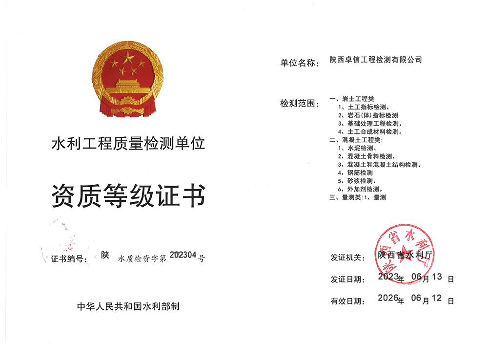 水利工程質(zhì)量檢測(cè)單位資質(zhì)等級(jí)證書(shū)